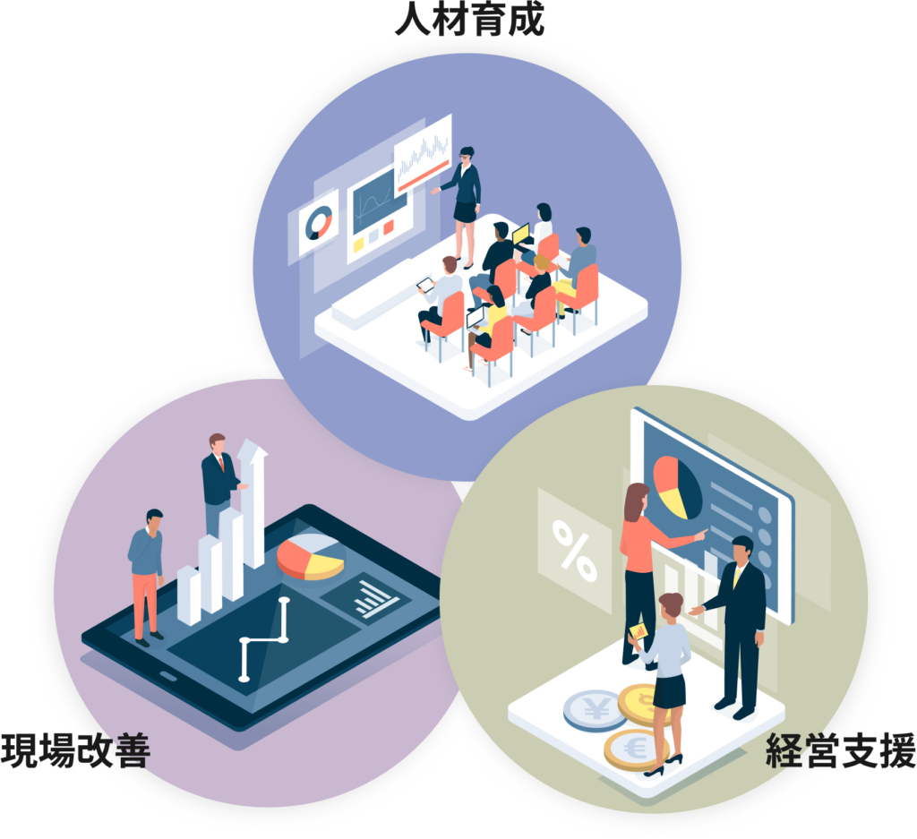 加えて、経営・人事制度の設計、現場の改善、新規事業の立ち上げに至るまで、経験豊かなコンサルタントが伴走し、貴社に最適なソリューションをご提供します。